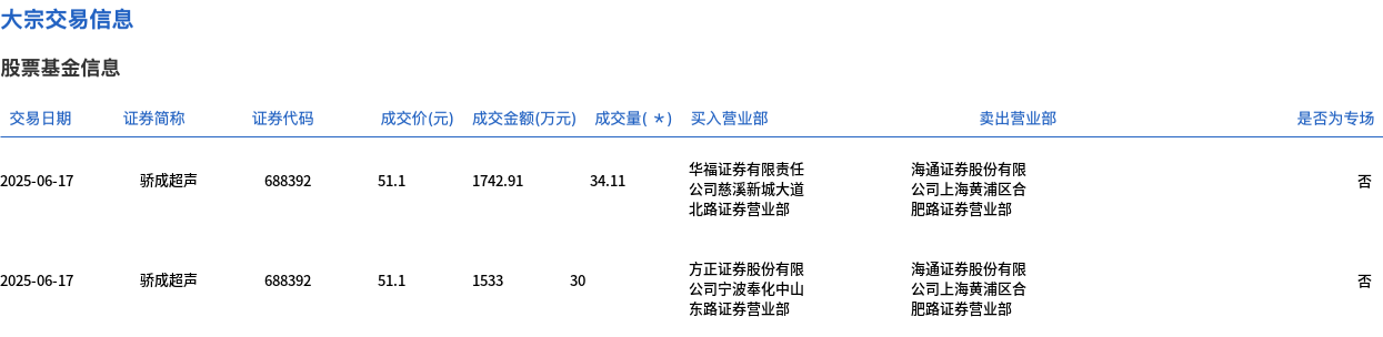 6月17日,骄成超声大宗交易成交64.11万股,成交额3275.91万元,占当日总成交额的19.96%,成交价51.1元,较市场收盘价56.16元折价9.01%。