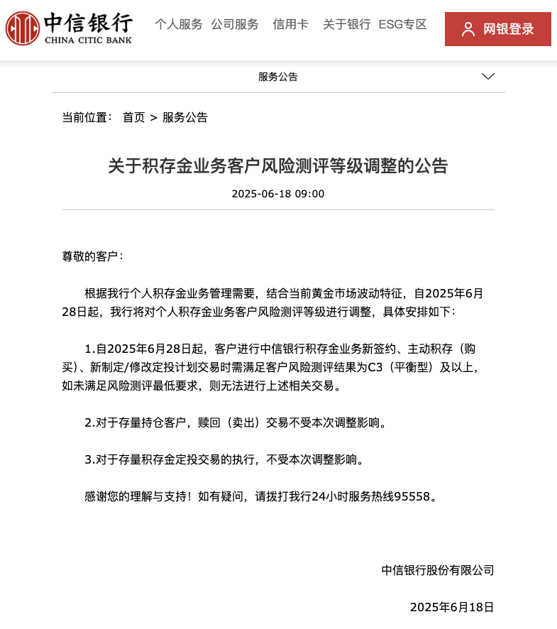 6月18日,中信银行发布公告,根据该行个人积存金业务管理需要,结合当前黄金市场波动特征,自2025年6月28日起,该行将对个人积存金业务客户风险测评等级进行调整,具体安排如下: