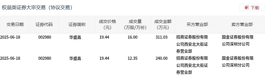6月18日,华盛昌大宗交易成交28.35万股,成交额551.03万元,占当日总成交额的1.26%,成交价19.44元,较市场收盘价22.17元折价12.31%。