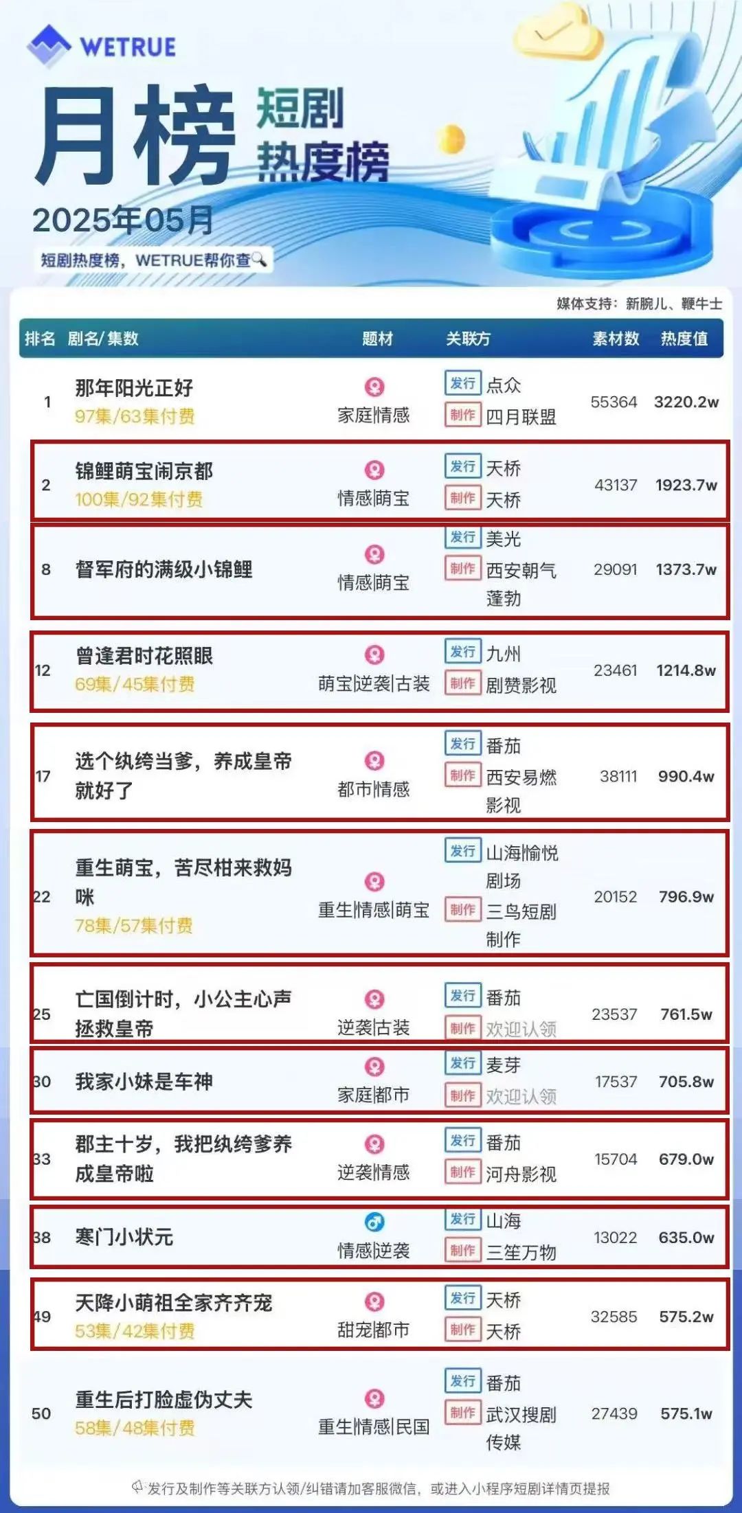 但萌宝短剧频出爆款,WeTrue数据显示,5月短剧榜单TOP50中萌宝类型题材占比约20%。