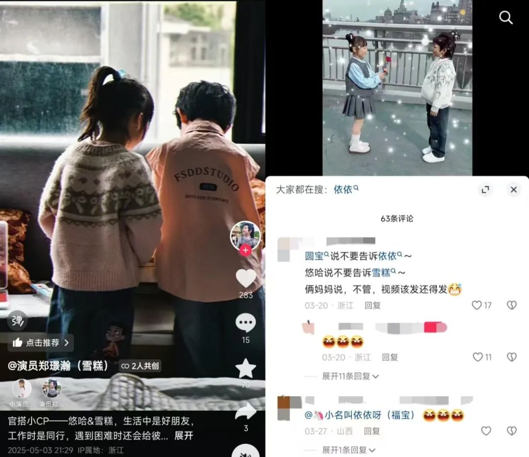 小演员们及其家长之间也形成紧密的社交圈。小演员雪糕和悠哈合作了《穿成恶毒亲妈后我洗白了》,圆宝和悠哈拍了《功夫双娃》,圆宝和雪糕也频繁抖音互动,活跃在屏幕的,来来回回都是熟悉的面孔,小演员圈也有自己的“换乘”生态。