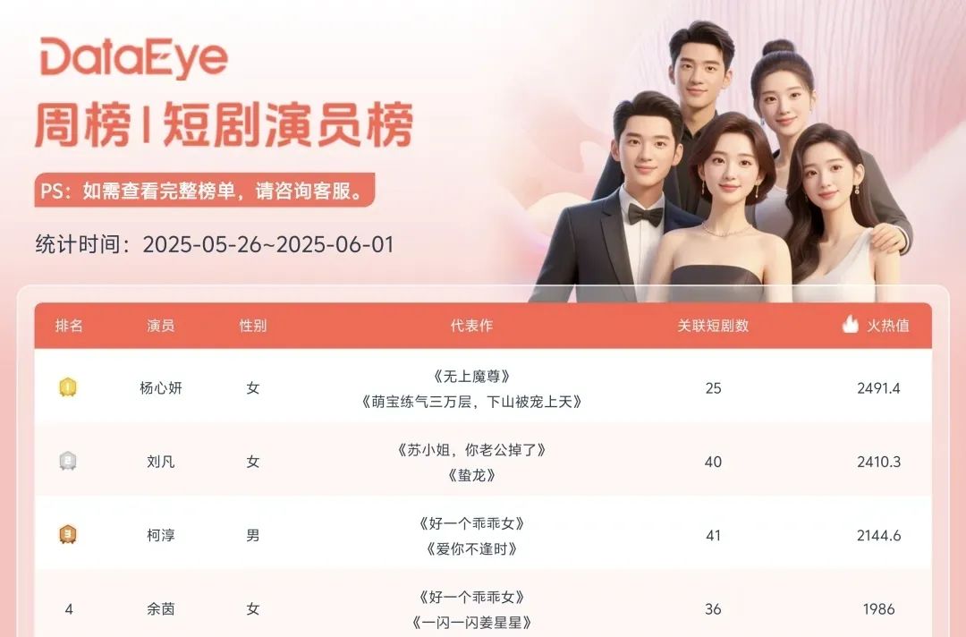 今年5月,DateEye短剧演员周榜,小演员杨心妍凭借新作《重生七零年代小锦鲤有空间》登顶,把短剧“一哥”柯淳甩在身后。