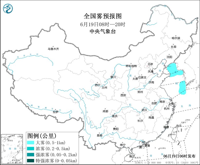 预计,6月19日白天,黄海北部海域、黄海中部部分海域、黄海东南部海域将有能见度不足1公里的大雾。