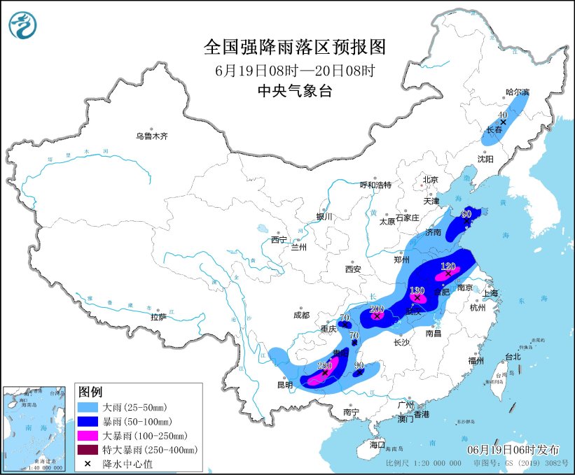 预计,6月19日08时至20日08时,黄淮中东部、江淮、江汉、重庆东部、湖南西部和北部、江西北部、贵州东部和南部、云南东部、广西北部等地部分地区有大到暴雨,其中,安徽中北部、江苏中部、湖北东北部和西南部、湖南北部、贵州南部、广西北部等地部分地区有大暴雨,贵州西南部等地局地特大暴雨(250~280毫米)。上述部分地区伴有短时强降水(最大小时降雨量20~50毫米,局地可超过80毫米),局地有雷暴大风等强对流天气。