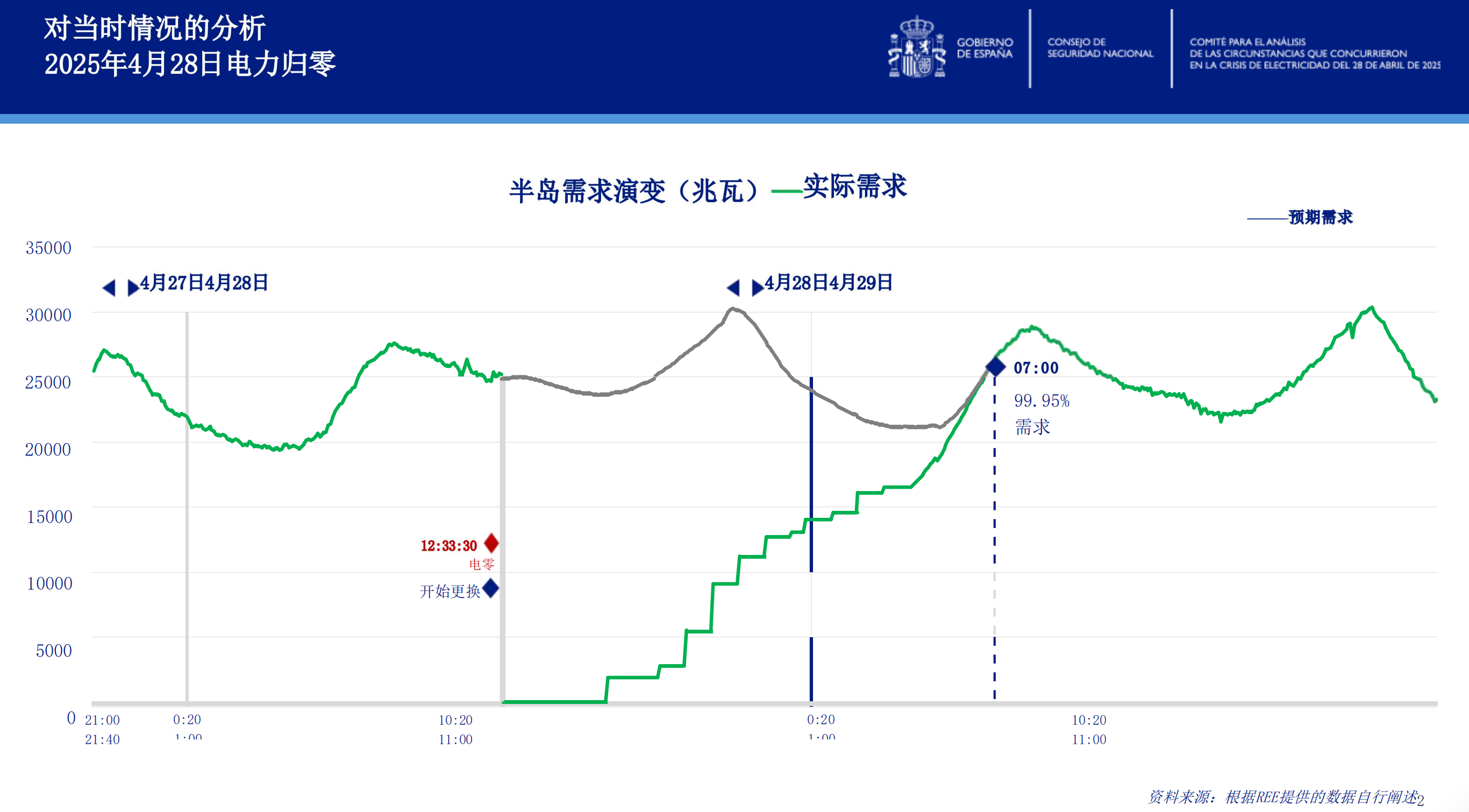 - 第二阶段:发电中断(12:32:57-12:33:18)。电压开始快速稳定上升,格拉纳达、巴达霍斯、塞戈维亚、韦尔瓦、塞维利亚、卡塞雷斯等省份的多处发电设施逐渐断电。