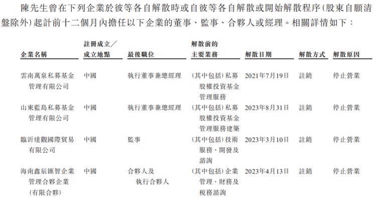 公告称,陈子淳“拥有逾六年投资、业务管理及行政经验”,同时公告还披露陈子淳之前担任过董事、监事、合伙人或经理现在全部注销、停止营业。