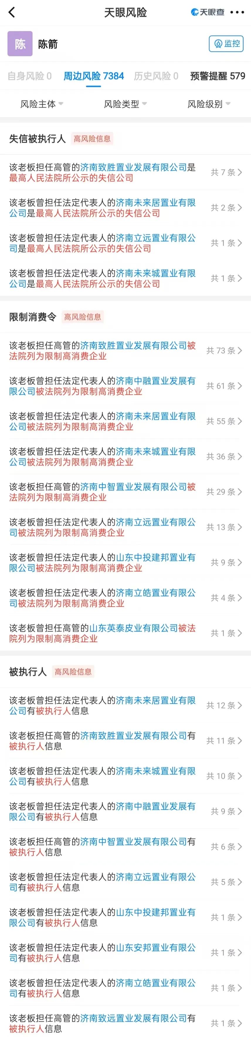 受房地产行业影响上,陈箭的事业也受到很大影响。天眼查显示,其担任高管或法人的4家企业,已经成为失信被执行人;担任高管或法人的6家企业被限制消费。此外,还有多家他担任高管或法人代表的企业是被执行人。