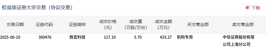 6月19日,胜宏科技大宗交易成交3.7万股,成交额433.27万元,占当日总成交额的0.11%,成交价117.1元,较市场收盘价117.1元持平。