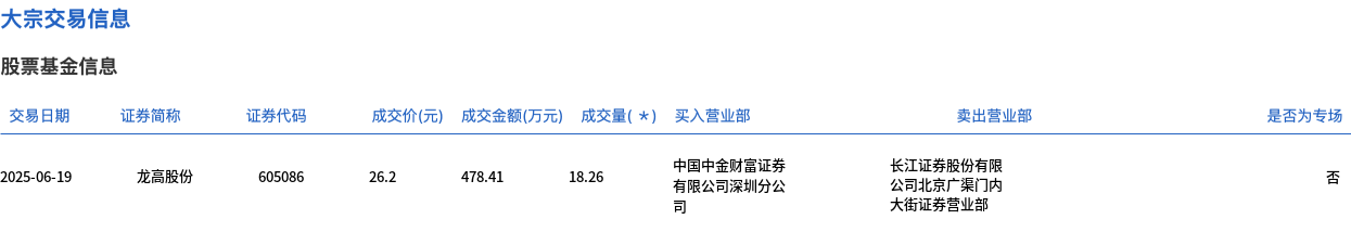 6月19日,龙高股份大宗交易成交18.26万股,成交额478.41万元,占当日总成交额的12.19%,成交价26.2元,较市场收盘价25.36元溢价3.31%。