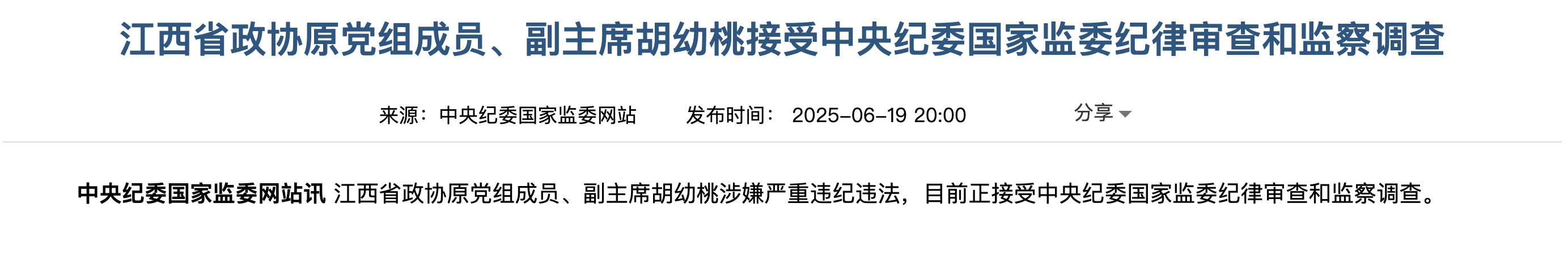 据中央纪委国家监委网站消息,江西省政协原党组成员、副主席胡幼桃涉嫌严重违纪违法,目前正接受中央纪委国家监委纪律审查和监察调查。