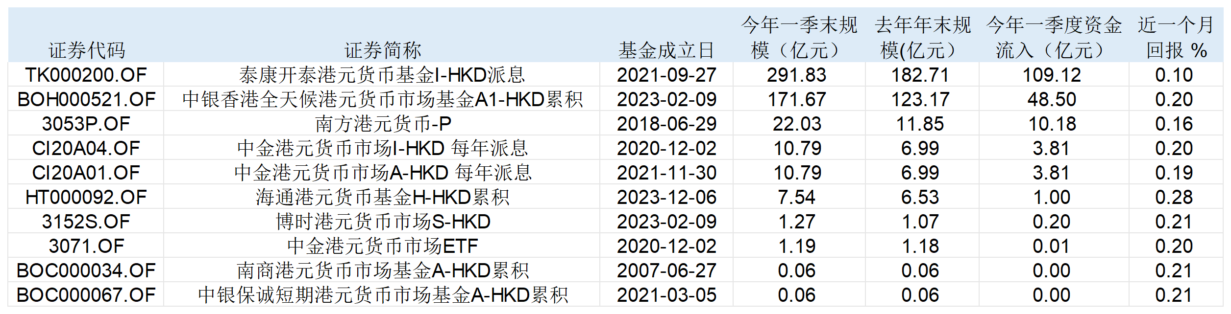 Wind数据显示,目前市面上共有174只港元货币基金(不同份额分开计算),其中,截止一季度末,规模超200亿元人民币的有泰康开泰、高腾微财、中银香港全天候、华夏精选这四只基金。对比去年年末的数据可以发现,一季度这四只基金净流入的金额分别为182.72亿元、170.9亿元、123.17亿元、68.42亿元。