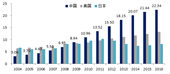 先看一下我国的金融体量有多大,不妨用大家所熟知的广义货币M2总量进行比较:截至2016年末,中国M2总量为22.34万亿美元,超过美国M2(13.28万亿美元)和日本M2(8.19万亿美元)之和。