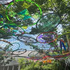 展览现场,数十个普通呼啦圈在学生手中完成华丽蜕变。据相关负责人介绍,创作要求学生以“圆”为基本形态,运用织物、金属、再生塑料等综合材料,在环形框架内构建独特的空间艺术单元。每一件作品都凝结着创作者的巧思,独立展示时个性鲜明,组合拼接后又形成浑然一体的 “艺术天幕”,完美诠释了“个体独特性与整体和谐性共生” 的创作理念。作品中,废旧材料的创意运用传递环保理念,材料质感与光影效果的碰撞展现空间美学,引得众多市民纷纷驻足,拍照分享。