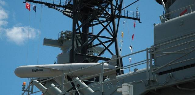 密苏里号上的战斧导弹是以8个四管箱型发射装置,都位于上层甲板,BGM-109战斧巡航导弹,是一种高亚音速巡航导弹,有反舰、反潜、对陆攻击等多种型号。其中甚至包括搭载核弹头的BGM-109A对陆核攻击巡航导弹,密苏里号上装备了8枚这个型号的战斧。