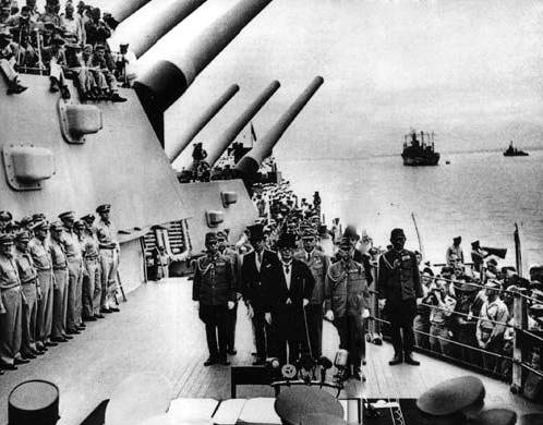 ▲历史的经典镜头,签字仪式的位置是密苏里号二号炮塔右侧甲板