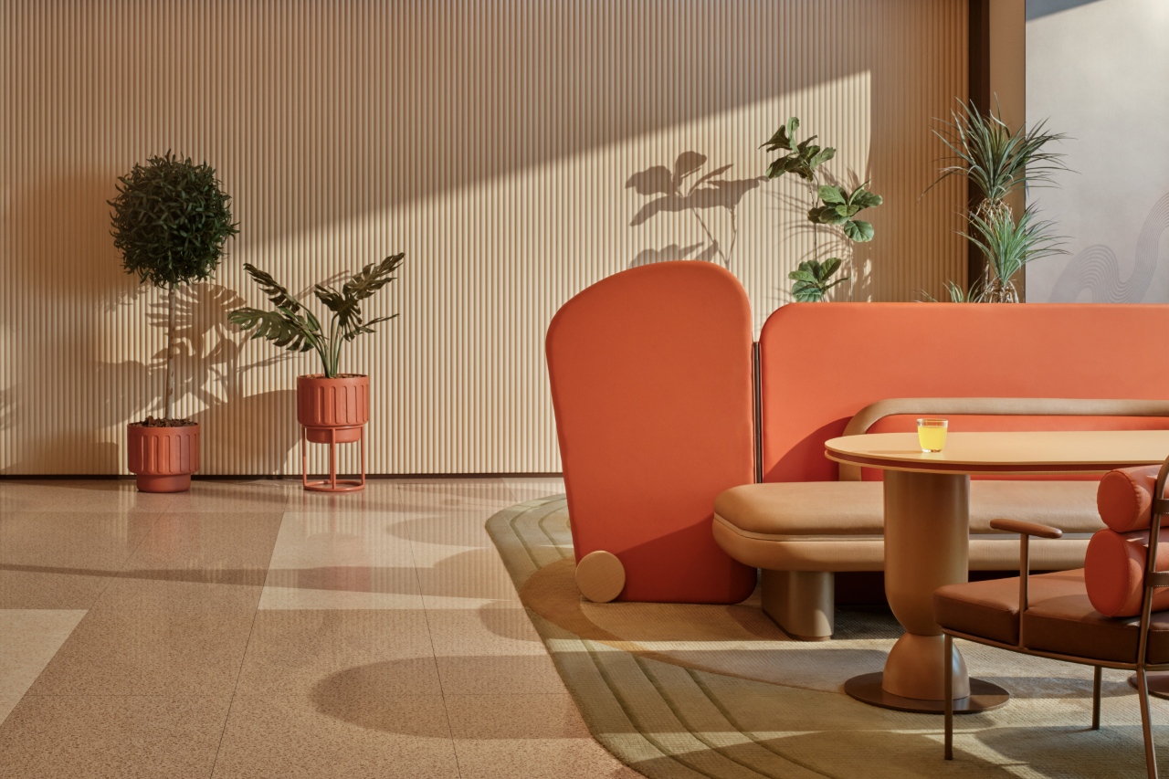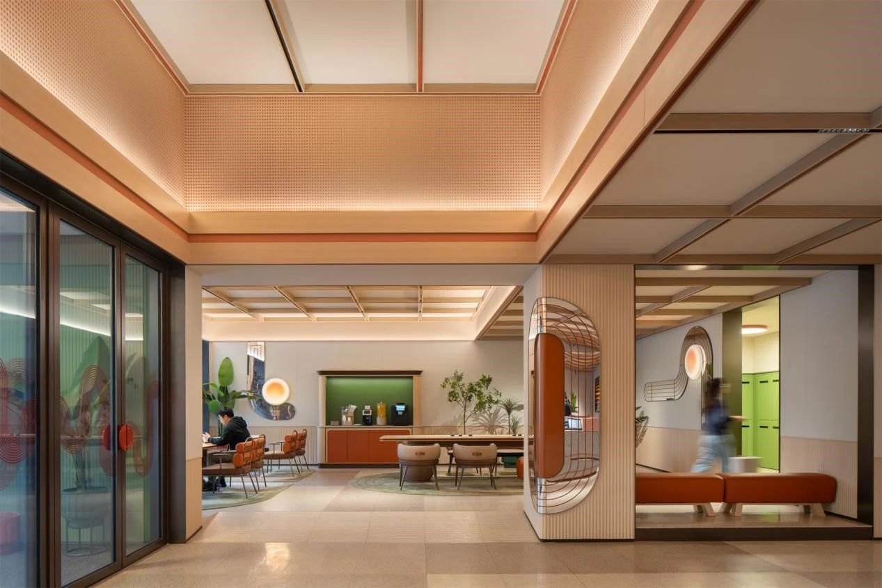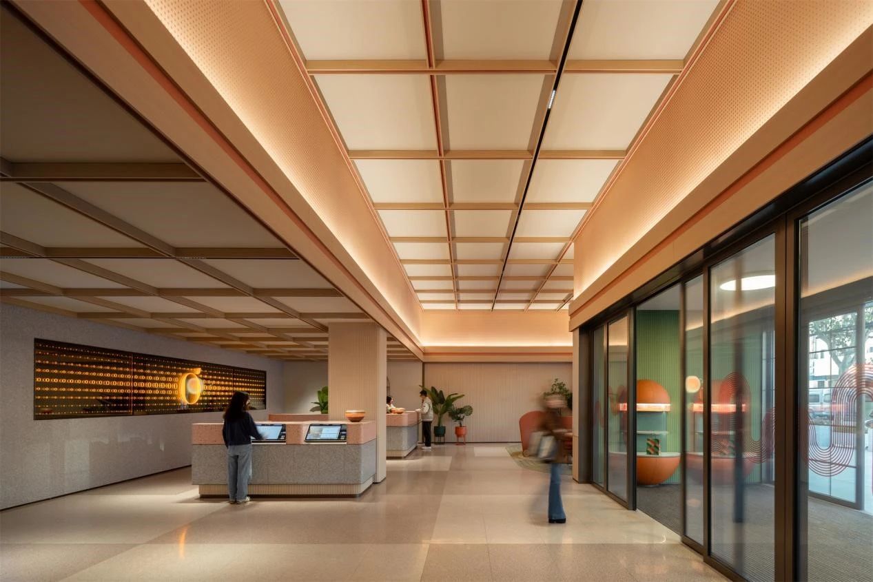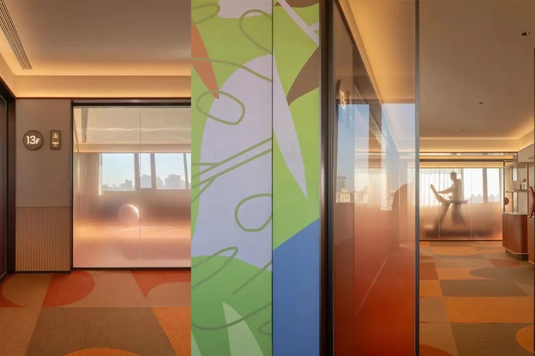 3.0版本对传统商务酒店的重塑,首先体现在空间构造与感官冲击上。一踏进桔子场域,桔色与绿色交织带来活力感、清新的柑橘香扑面而来,仿佛置身自然,让身心自由“吸氧”。环顾四周,以桔子为原型切割出的色彩明快、充满活力多巴胺几何图形,遍布墙面、大堂、走廊地毯等,随处可见的明媚色调,为住客带来一场快乐“桔气冲击波”。