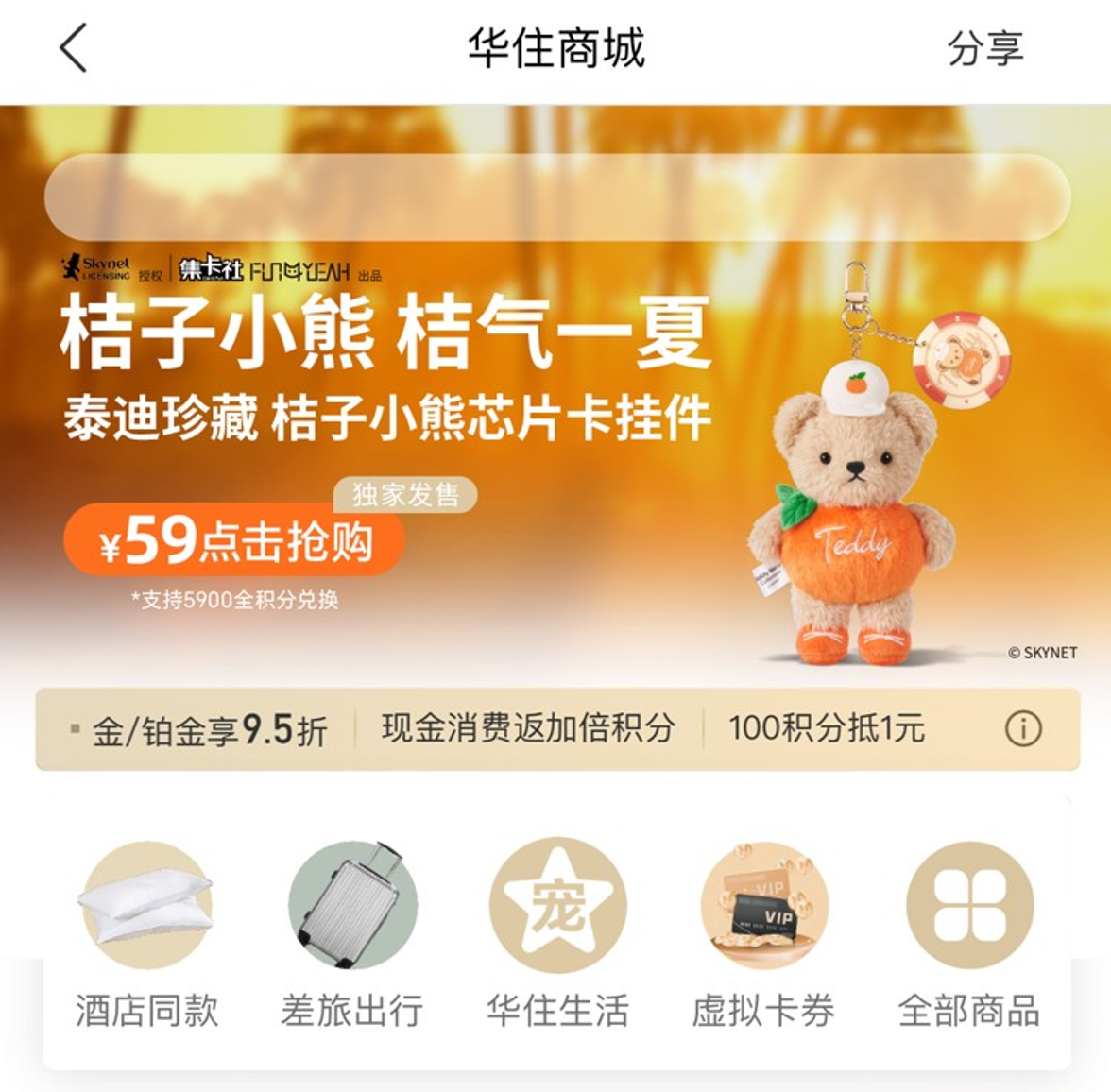 这个暑期,桔子酒店开启1000店宠粉活动,还与泰迪珍藏推出限定版“桔子小熊”泰迪熊挂件,旅客可以通过华住会商城、积分兑换或订房套餐带走小熊,带着小熊去旅行。活动一推出,迅速圈粉年轻人、亲子家庭。在情绪经济正火热的当下,桔子又在酒店圈掀起新一轮“多巴胺”热潮。