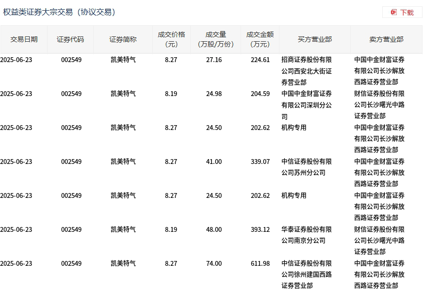 6月23日,凯美特气大宗交易成交264.14万股,成交额2178.61万元,占当日总成交额的3.22%,成交均价8.25元,较市场收盘价9.53元折价13.45%,其中最高成交价8.27元,最低成交价8.19元。