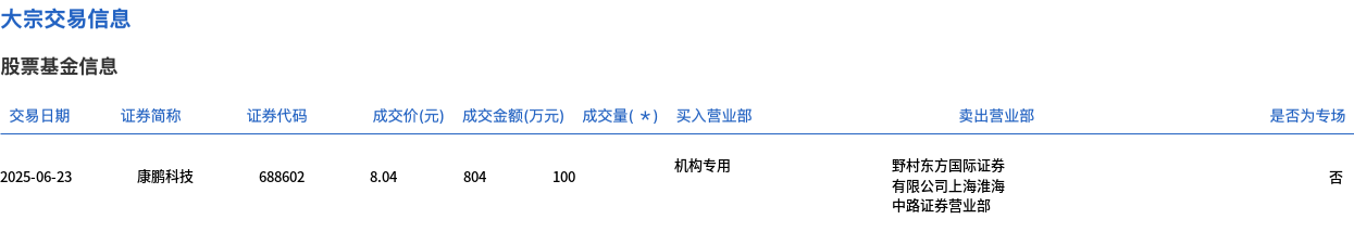 6月23日,康鹏科技大宗交易成交100万股,成交额804万元,占当日总成交额的16.92%,成交价8.04元,较市场收盘价8.1元折价0.74%。