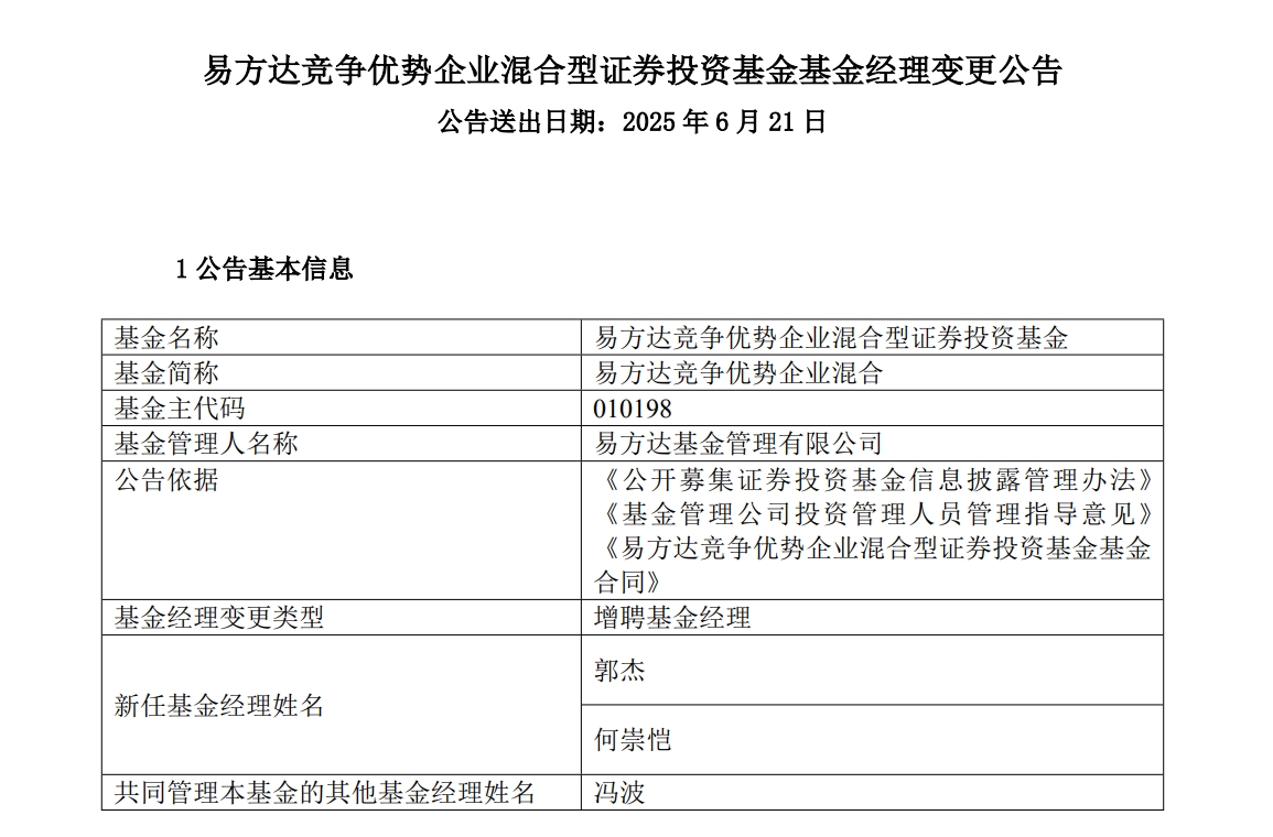 6月21日,冯波管理的易方达竞争优势企业、易方达研究精选公告称,分别增聘郭杰、何崇恺、彭珂为基金经理。至此,冯波已经没有单独管理的基金。