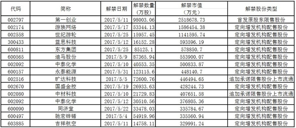附表:5月解禁市值较大的部分公司