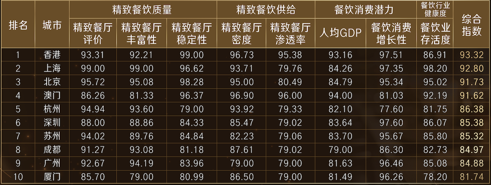 头部城市凸显区位禀赋:港澳依托国际贸易自由港及旅游目的地的地位,在精致餐厅稳定性(99.00分/96.37分)和精致餐厅密度(96.73分/96.90分)上建立核心优势,港澳两地米其林餐厅数量占10个观察城市总量的31%,印证了它们在亚太高端餐饮市场的统治地位。上海、北京凭借超大城市能级,在精致餐厅评价(99.00分/95.72分)与精致餐厅丰富性(99.00分/95.08分)上展现统治力。内地新锐呈现差异化短板——杭州餐饮消费增长性(77.60分)拖累其高端供给优势(精致餐厅密度93.92分);深圳虽餐饮消费增长性冠绝榜单(97.60分),但精致餐厅稳定性(84.33分)制约排名。值得注意的是,成都在餐饮业存活度(82.73分)及人均GPD(79.00 分)指标承压,反映内陆市场差异很大。