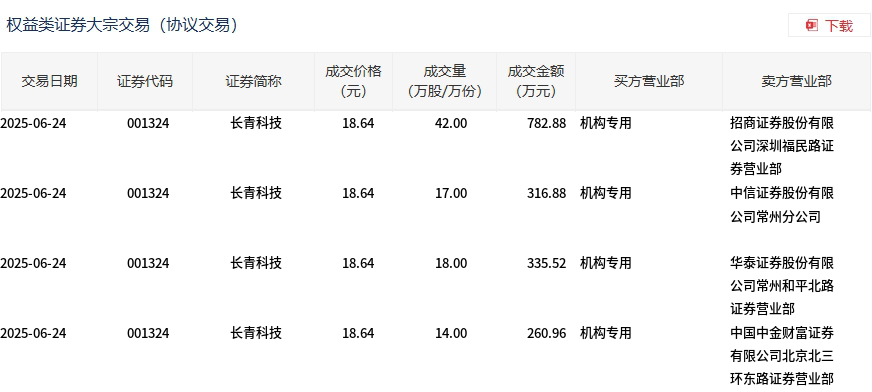 6月24日,长青科技大宗交易成交91万股,成交额1696.24万元,占当日总成交额的17.98%,成交价18.64元,较市场收盘价18.81元折价0.9%。