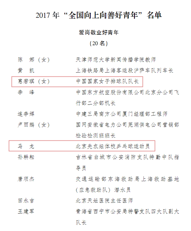 昨日(5月3日),共青团中央在官方网站上发布了“共青团中央关于表彰2016年度“全国优秀共青团员” “全国优秀共青团干部” “全国五四红旗团委(团支部)” 和 “全国向上向善好青年”的决定”。其中女排队长惠若琪、乒乓球国手马龙、胡歌、张艺兴等出现在名单之中。