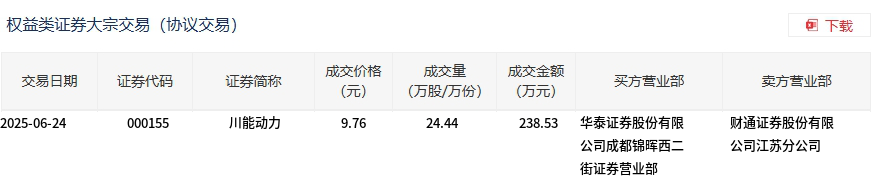 6月24日,川能动力大宗交易成交24.44万股,成交额238.53万元,占当日总成交额的2.1%,成交价9.76元,较市场收盘价9.79元折价0.31%。