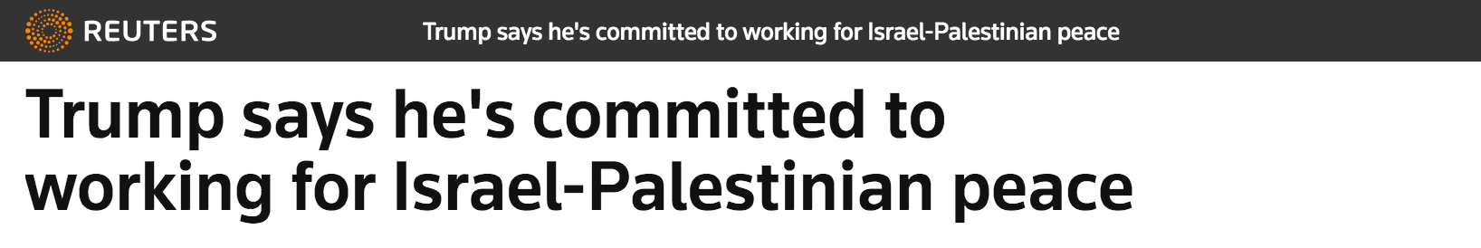 【特朗普:将致力于以巴和平】特朗普周三在会见巴勒斯坦总统阿巴斯(Mahmoud Abbas)时表示,将致力于建立以色列和巴勒斯坦的和平关系,但并没有谈到如何打破双边关系的僵局。