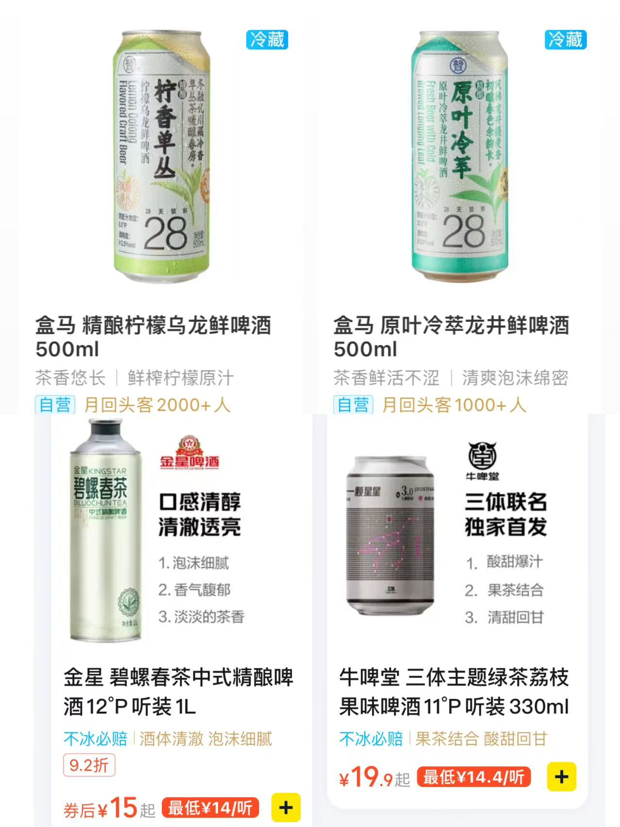 同时,销售茶啤的渠道也从线上拓展至线下。在山姆会员超市,已有龙井小麦精酿啤酒在售。盒马也推出了自有品牌的柠檬乌龙茶啤和冷萃龙井鲜啤。在即时零售平台歪马送酒上,也出现了金星茶啤,以及该平台的自有品牌精酿中式茶啤。
