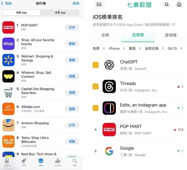 期间,也就是今年4月,LABUBU3.0线上24日发售,线下25日发售。产品在欧美地区的抢购热潮,成为了POP MART 登顶美国App Store购物榜的核心原因。自这次首次登顶后,POP MART App就成为了这个榜单常客。