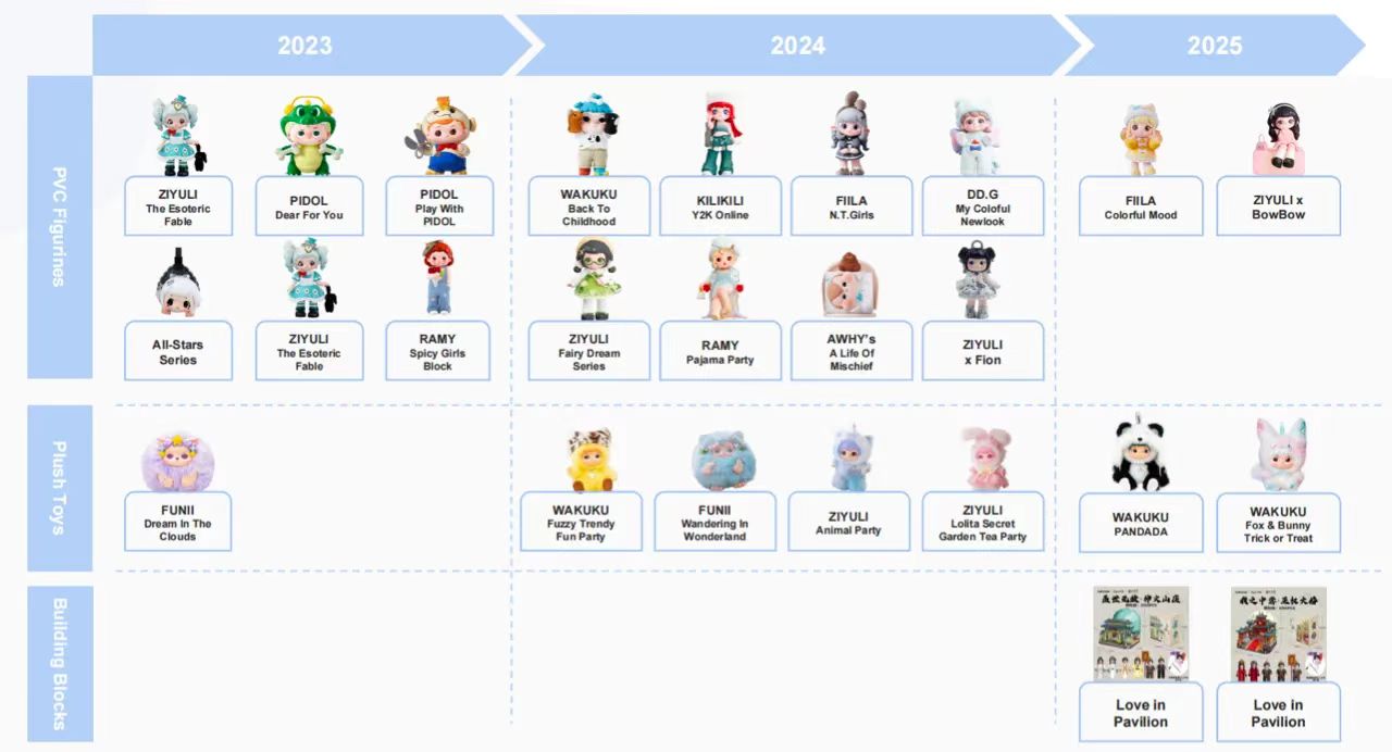 根据量子之歌披露的信息,Letsvan旗下的产品组合除了WAKUKU外,还包括ZIYULI、FUNII、PIDOL和FIILA等9个热门玩具IP,并且已经拥有了一批忠实粉丝。