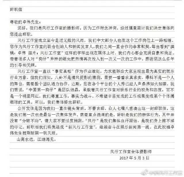 2017年5月3日中午15:03分,ID为“新风行工作室”的微博账号发布一篇名为“山高水远,初心不变”的公开辞职信,在该公开信中,称因为“工作理念”不同,风行工作室的摄影师集体辞职。