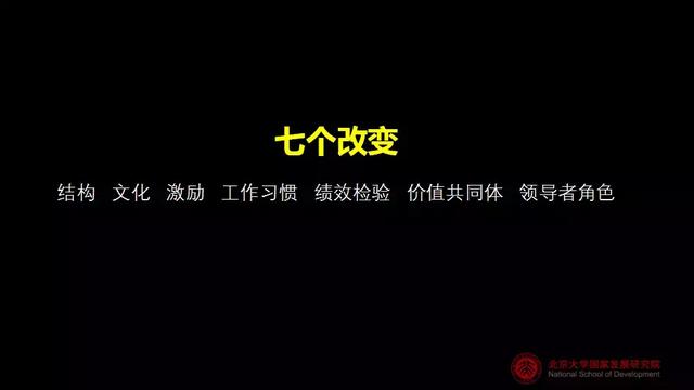 我们做一个激活组织的动作实际上改了七个东西,结构、文化、激励、工作习惯、绩效检验、价值共同体、领导者角色。