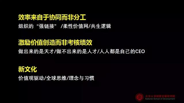 接着下来最后一个要回答的就是今天的文化内涵到底是做什么。我们以前在谈文化的时候,比较在意的是内部价值观的趋同,而且在今天巨变的环境下价值观趋同变得比以往任何一个时间更短,为什么你可以授权和赋能?原因就是你是价值观相同的人,所以不用担心这件事情。价值观相同必须通过一个文化做联系,这个文化到底应该怎么做?我们在组织管理里面就变成了比较大的挑战。我们在谈今天的组织管理实际上有三个根本性改变,意义上来讲是交给我们管理学者要回答的问题,而在实践当中很多优秀的企业已经做了,是怎么做的?