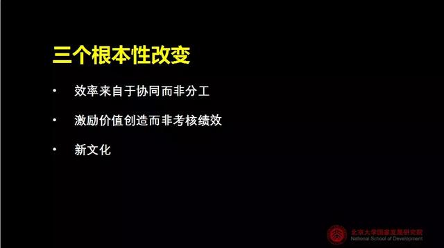 第二个改变是什么?就是我们到底是做绩效考核,还是做价值创造?今天核心的价值创造,已经不再是我们讲的考核绩效,如果你考核绩效会发现人的创造是要被禁锢掉的。我们的工作习惯就是,你的指引是什么就做什么,你考核什么做什么。而如果用很严的绩效考核,创造力就会被扼杀掉。所以一定有一个很大的组织改变,这个改变就是,从考核绩效转向激励价值创造,这是一个非常棒的改变。这个改变其实在组织理论当中也是一个必须要回答的问题。