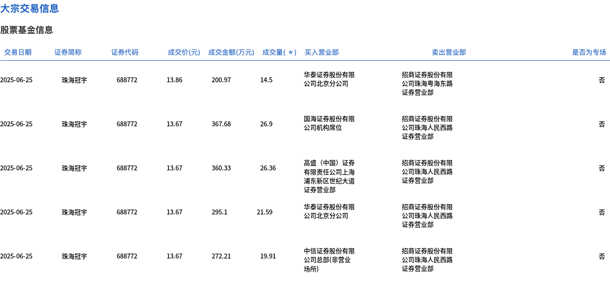 6月25日,珠海冠宇大宗交易成交174.8万股,成交额2392.21万元,占当日总成交额的4.87%,成交均价13.69元,较市场收盘价14.9元折价8.15%,其中最高成交价13.86元,最低成交价13.67元。
