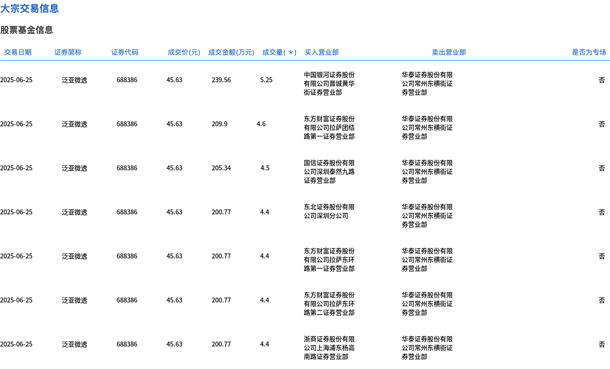 6月25日,泛亚微透大宗交易成交31.95万股,成交额1457.88万元,占当日总成交额的7.22%,成交价45.63元,较市场收盘价53.12元折价14.1%。