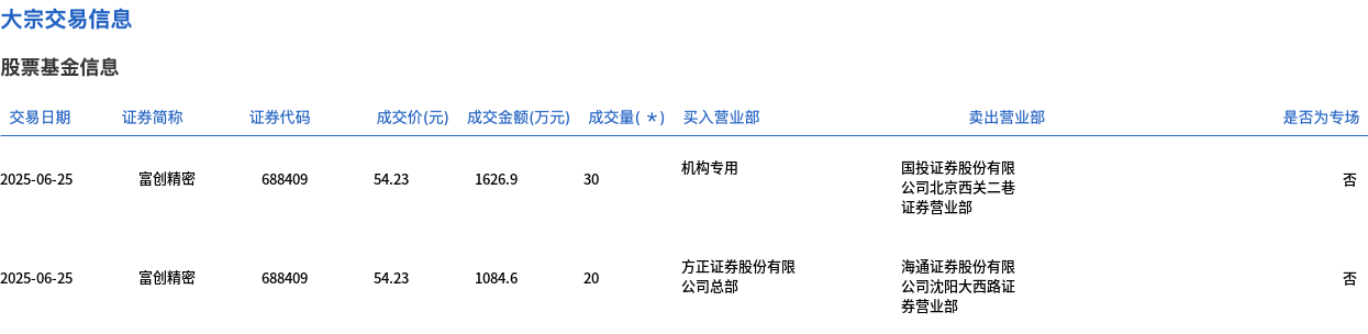 6月25日,富创精密大宗交易成交50万股,成交额2711.5万元,占当日总成交额的10.55%,成交价54.23元,较市场收盘价54.5元折价0.5%。