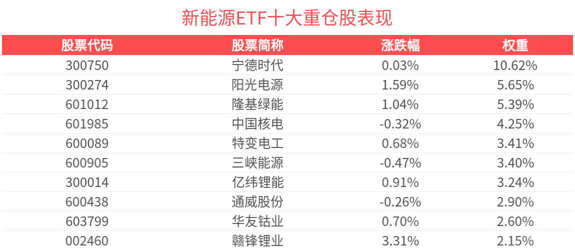 数据显示,截至2025年5月30日,中证新能源指数前十大权重股分别为宁德时代、阳光电源、隆基绿能、中国核电、三峡能源、特变电工、亿纬锂能、华友钴业、通威股份、赣锋锂业,前十大权重股合计占比44.89%。