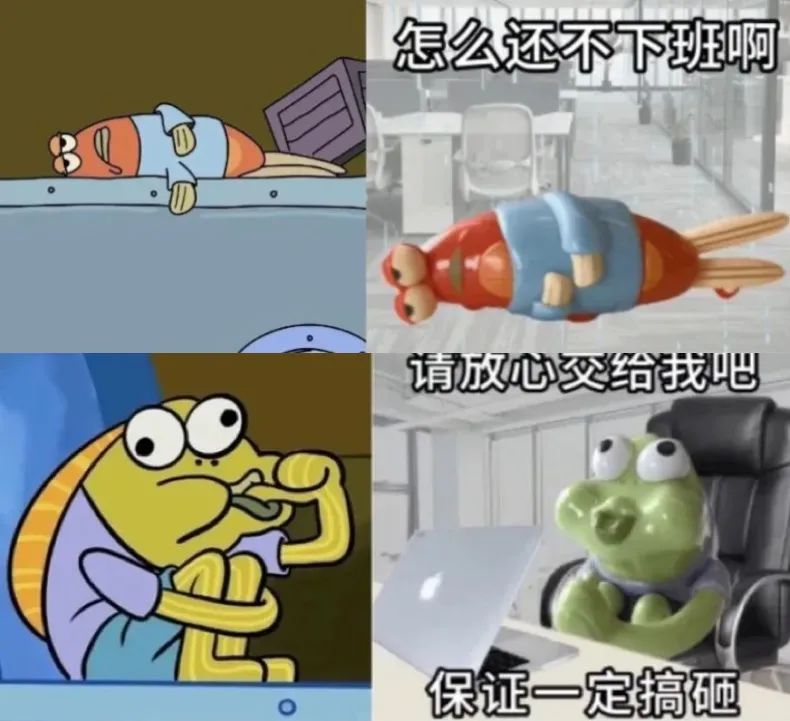 不只是自己的品牌IP玩得“疯”,联名也是瑞幸共情年轻人的方式。最近,瑞幸和《海绵宝宝》推出的联名发条玩具,选择的对象不是主角海绵宝宝和派大星,而是比奇堡的两条路人鱼。它们虽然不出名,但之前就活跃在“发疯”表情包里。