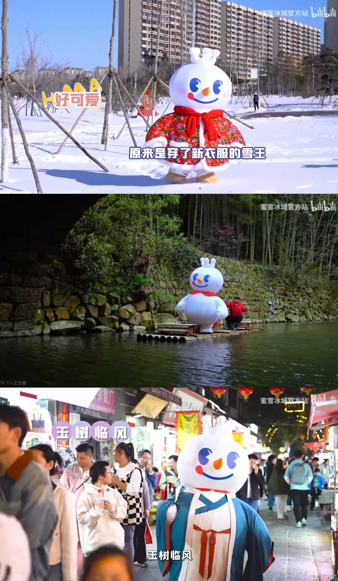 而后它的“演艺事业”进一步扩大,拥有了自己的表情包,人设也更加鲜明。2023年,动画片《雪王驾到》开播,网友以为是下饭日常番,结果是冒险热血番。同时,雪王还在抖音、B站等平台扮演“街溜子”,下江南,到洛阳,逛东北,突出“活人”感。