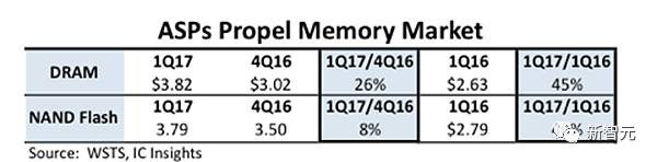 由于DRAM和NAND闪存平均销售价格惊人上涨,三星的销售额也大幅增长(见上图)。IC Insights报告预计,由DRAM和NAND闪存带来的巨大收益将在2017年下半年开始下滑,但尽管如此,IC Insights目前的预测是,2017年DRAM市场增长39%,NAND闪存市场增长为25%。