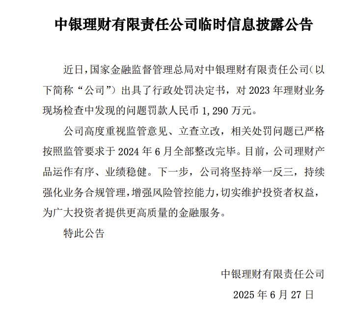 6月27日,中银理财在其网站公告,近日,国家金融监督管理总局对公司出具了行政处罚决定书,对2023年理财业务现场检查中发现的问题罚款人民币1290万元。公司高度重视监管意见、立查立改,相关处罚问题已严格按照监管要求于2024年6月全部整改完毕。目前,公司理财产品运作有序、业绩稳健。