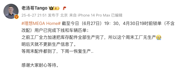 6月27日晚间,理想汽车产品线负责人汤靖在社交平台发文透露,关于理想MEGA Home,截至今日(6月27日)19:30,4月30日19时前锁单(不含改配)用户已完成下线和车辆匹单;之前工厂全力加速把库存配件全部生产完了,所以这个周末工厂无生产。明后天就不更新生产信息了。等周末配件都到了,下周一恢复生产。