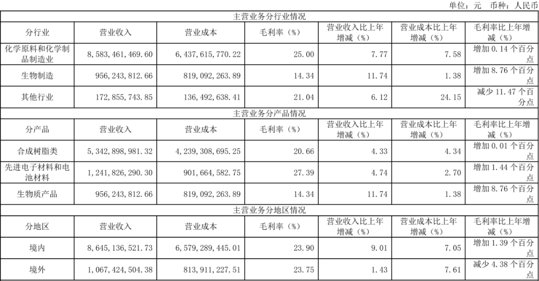 按照公司2024年年报中分类,其产品分为合成树脂类、先进电子材料和电池材料、生物质产品。其收入构成如下: