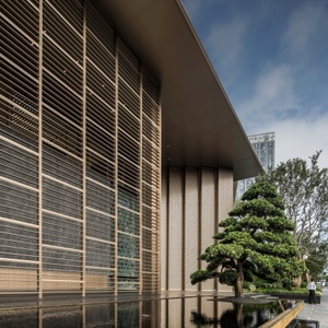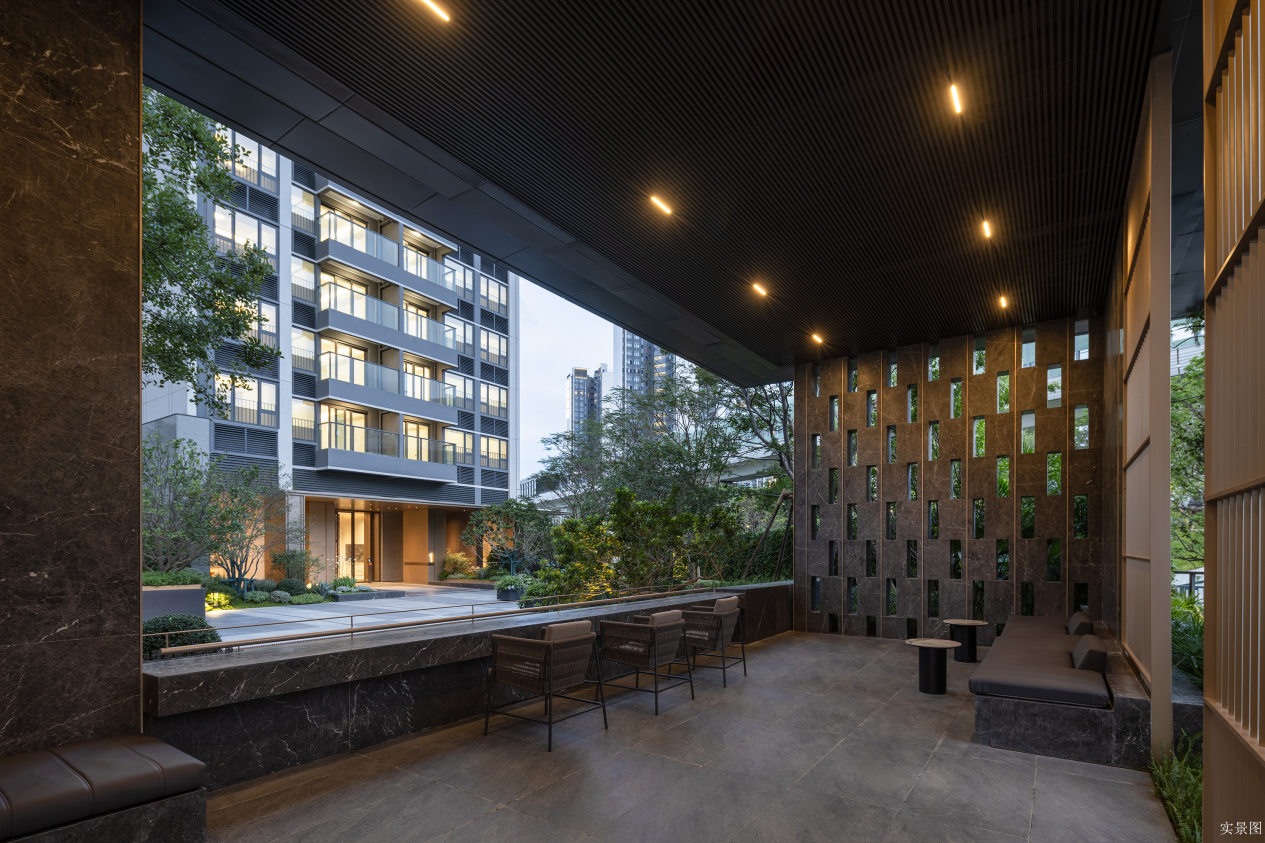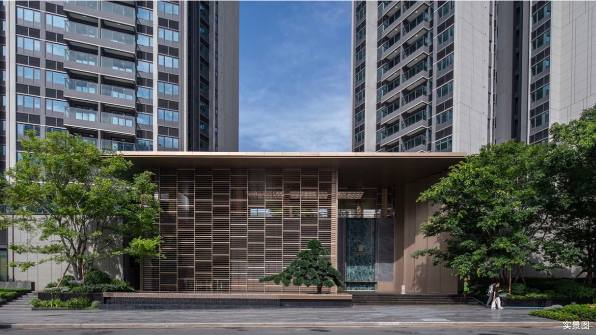 门廊前的精致叠水、小泉,以极具标识性的水中景松,和两边的姿态优美的造型朴树,呈现出“松迎客至,泉洗尘心”的东方意境,突显强烈的尊贵感和奢华仪式感。