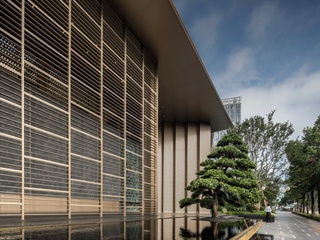 踏入交付现场,映入眼帘的是约25米超阔门幅、10米挑高的大门,以“登堂入室”的传统礼序为灵感,通过三重递进式台阶与上扬的金属檐口,构成步步高升的空间隐喻。整面Prada绿奢石立面流动着苔藓状天然纹路,与金属格栅碰撞出古典与当代的美学共鸣,一同构造成目前北站片区最具昭示性的大门设计。