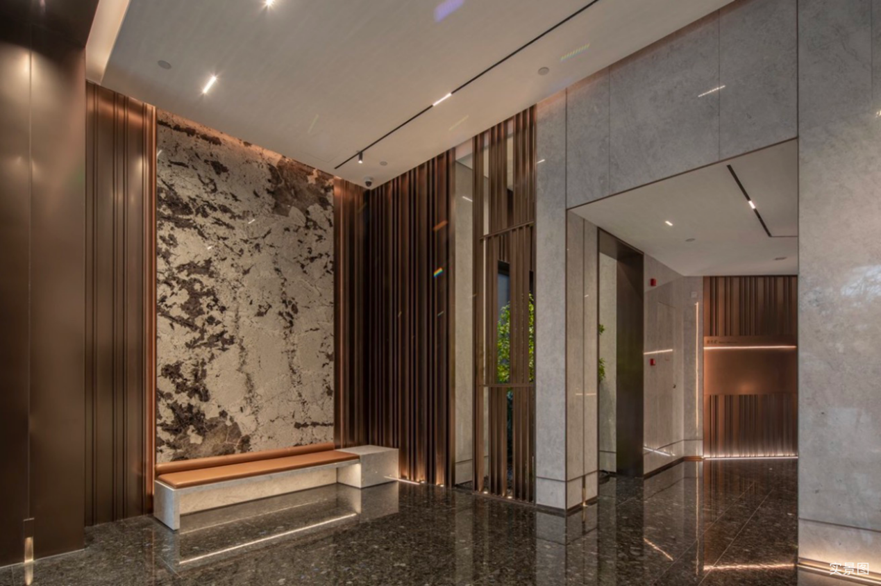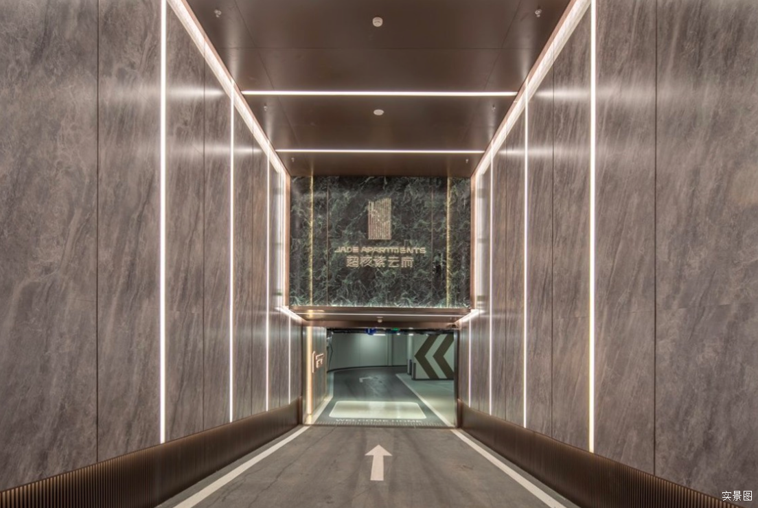 地下室大堂及泛大堂延续了首层公区的精装风格,墙地面采用奢石,对景墙选用山水主题天然石材。同时,对车行归家动线,比如车道出入口的氛围感和整体亮度进行了一系列的提升,以温暖的灯光指引着业主归家,将仪式感和精致感相互交融。